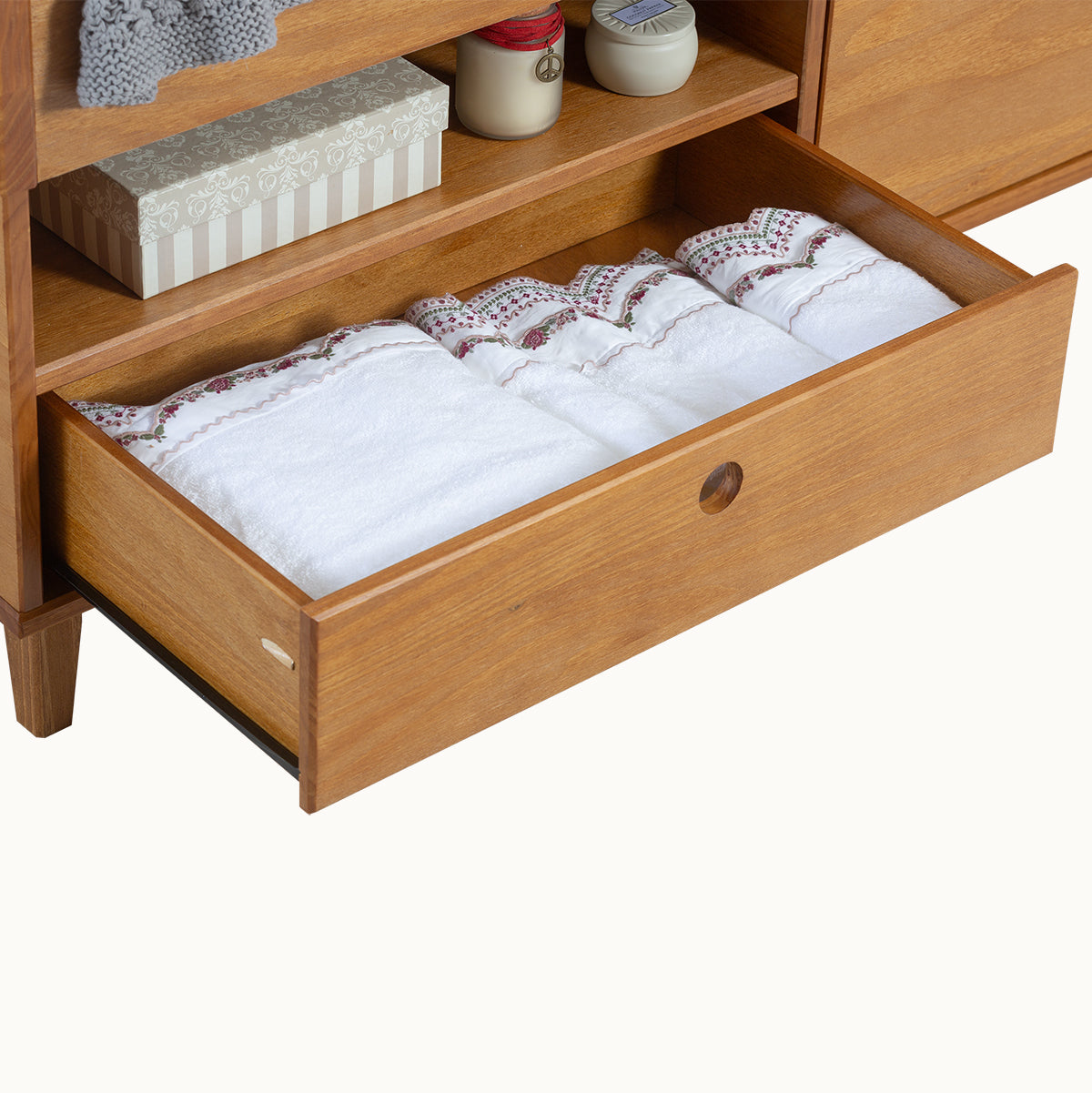 Nos meubles sont fabriqués à partir de bois provenant d'arbres spécialement plantés à cet effet. Comme il s'agit d'un matériau 100 % naturel, le bois peut présenter de légères variations de couleur et de structure. Il ne s'agit pas d'un défaut, mais d'une particularité que seul le bois naturel peut offrir.