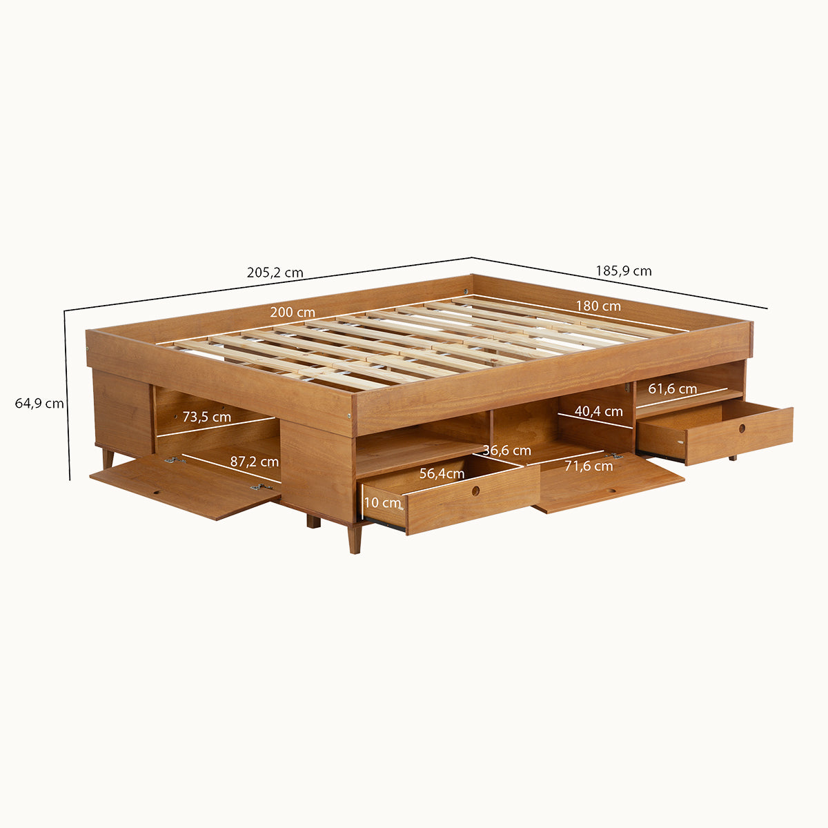 Les pieds de 10 cm de haut permettent un nettoyage facile sous le lit.