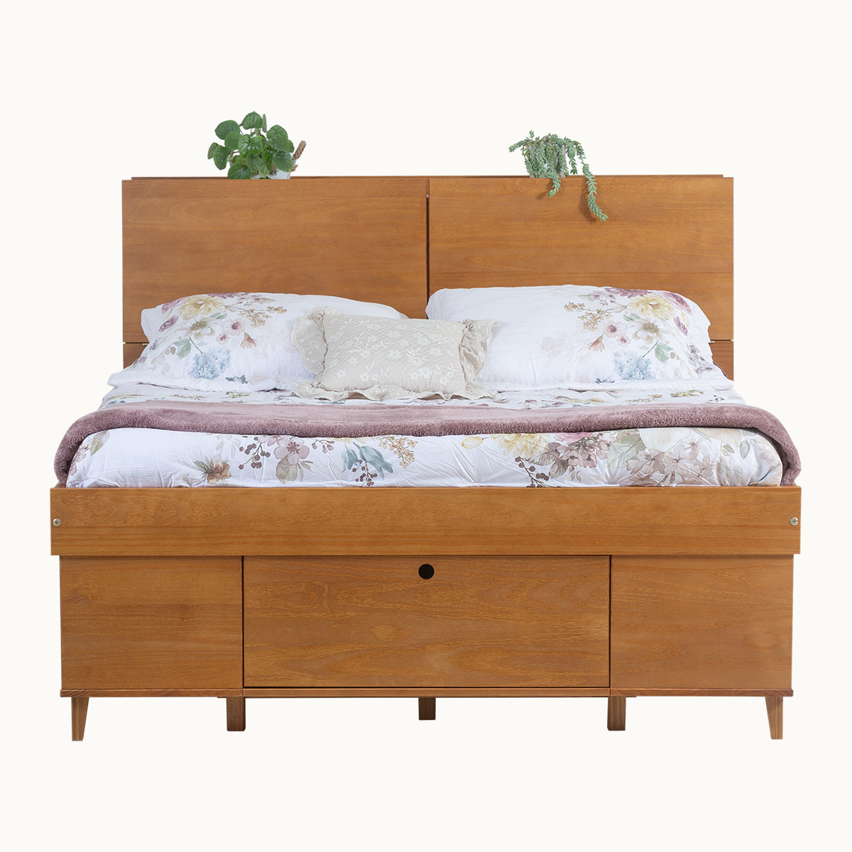Vous recherchez un lit double solide, esthétique et fonctionnel ? Avec son design vintage, le lit fonctionnel Amalfi avec tiroirs est idéal pour tous ceux qui recherchent un lit robuste et durable avec beaucoup d'espace de rangement : ce lit en bois offre 4 tiroirs, 3 compartiments avec portes et 4 étagères pour ranger le linge de lit, les couettes, les cartons, les objets décoratifs et tout ce que vous voulez !