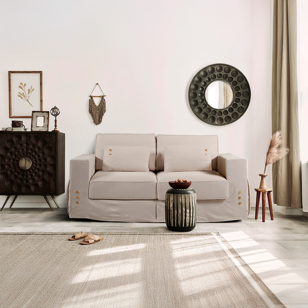 Un canapé qui respire le confort et l'intemporalité ! Sa simple présence dans le salon donne déjà un air de confort. En outre, son plus grand avantage est son côté pratique ! Le canapé est entièrement recouvert d'une housse qui, si nécessaire, peut être facilement enlevée et lavée. L'ajout de deux petits coussins apporte encore plus de confort et un charme esthétique.